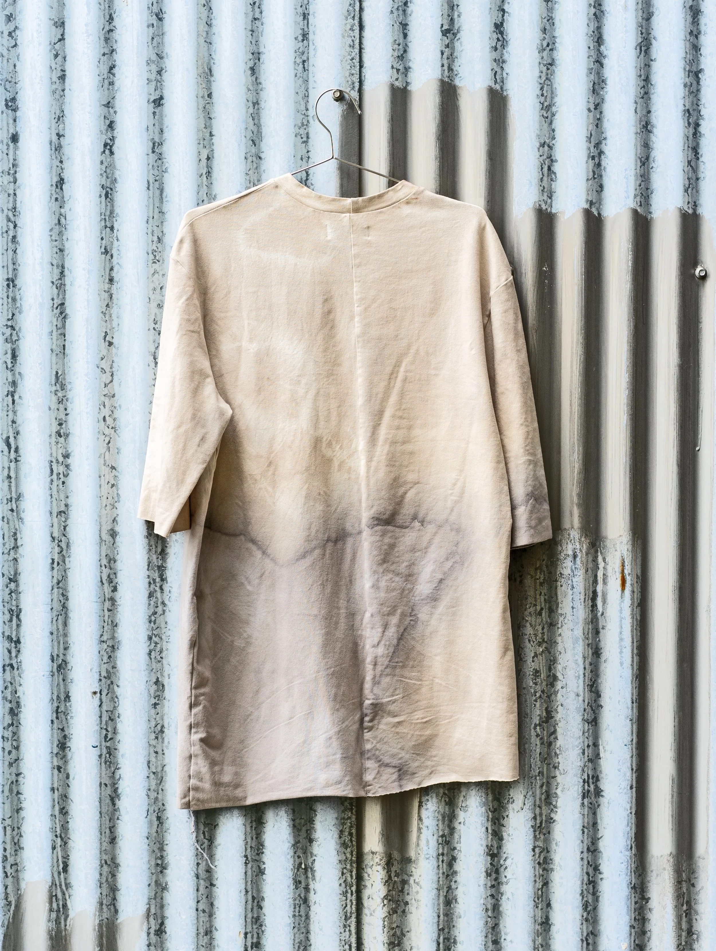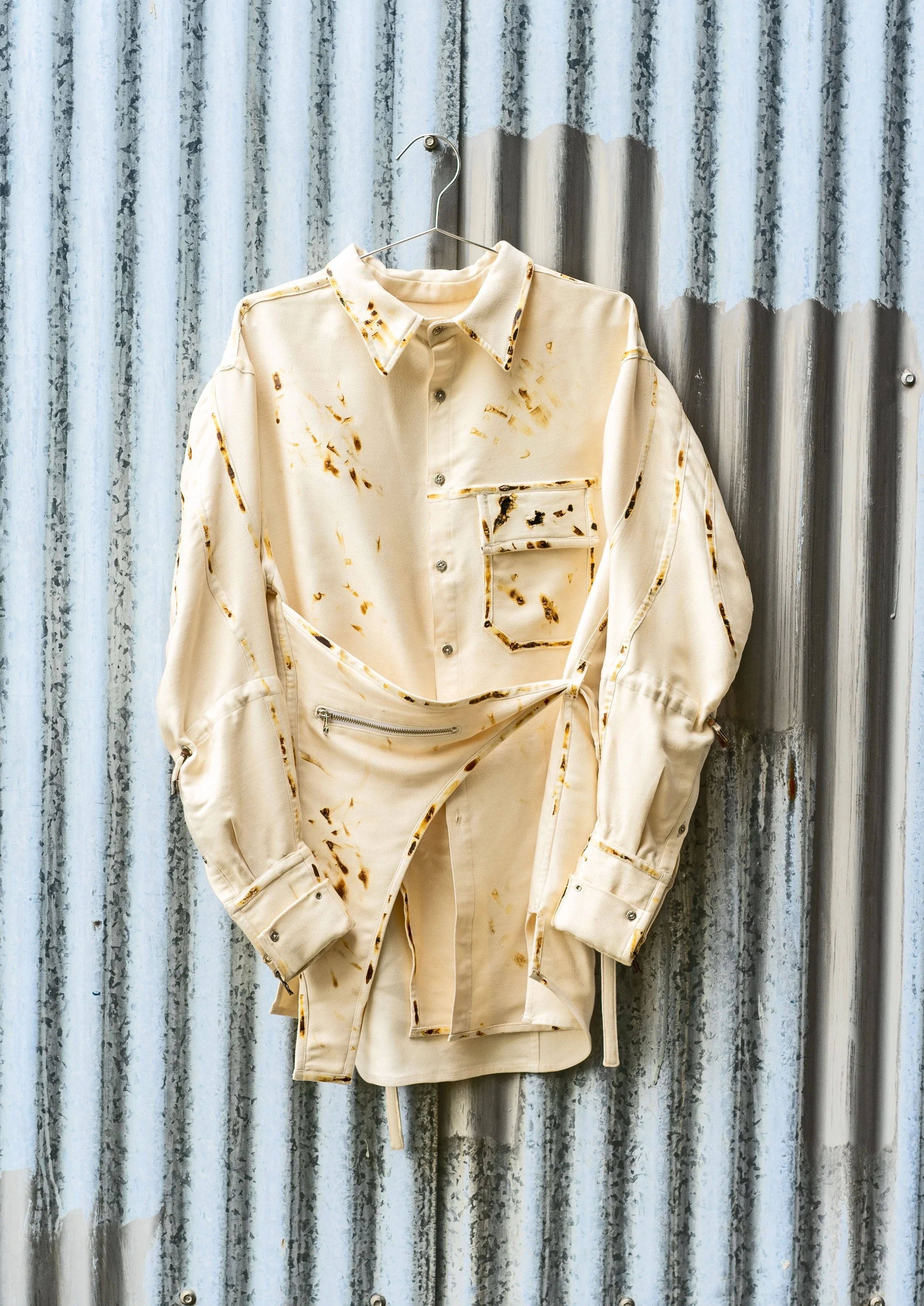 Cream-colored shirt with brown stains hanging on a hanger on a corrugated metal wall.