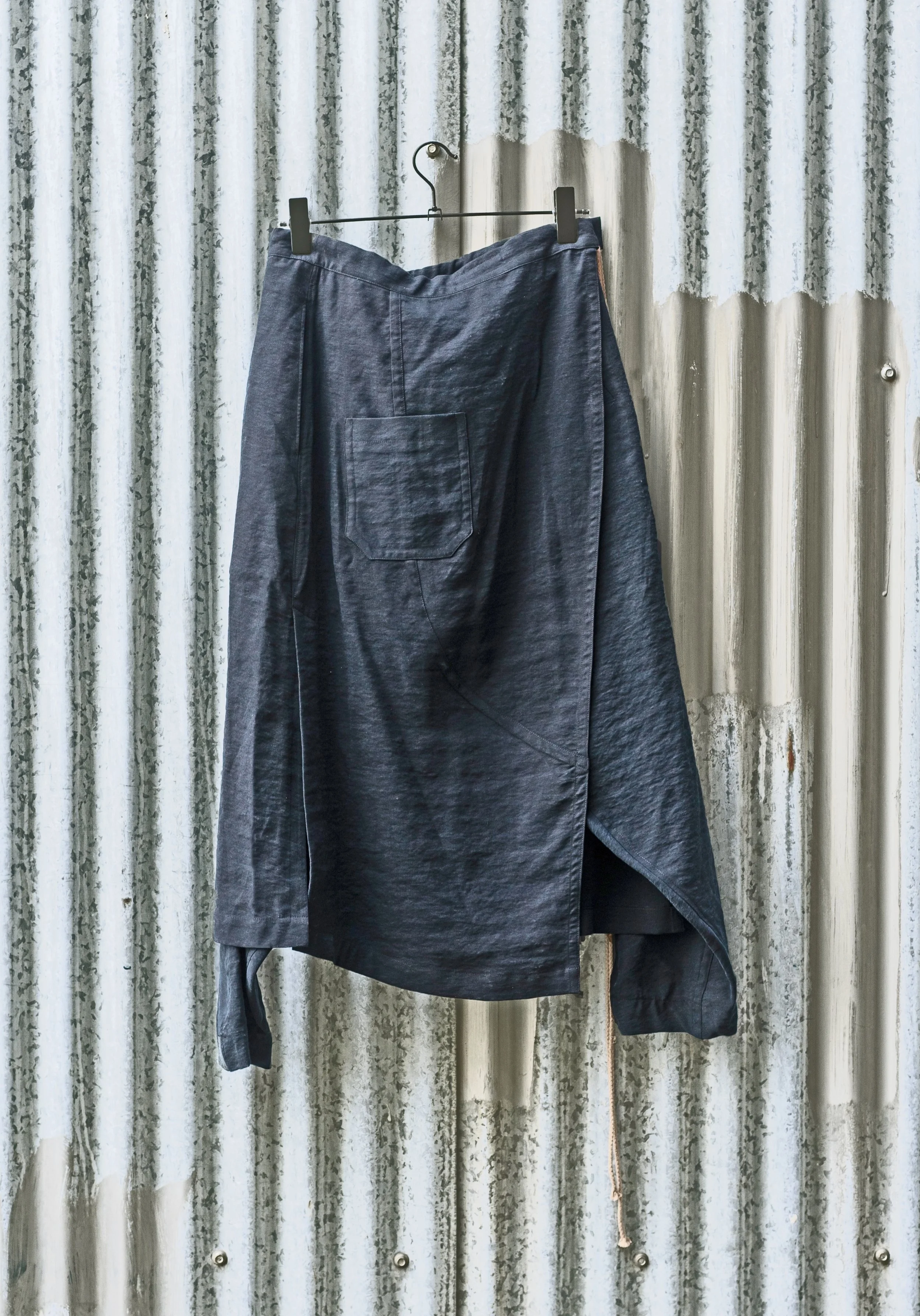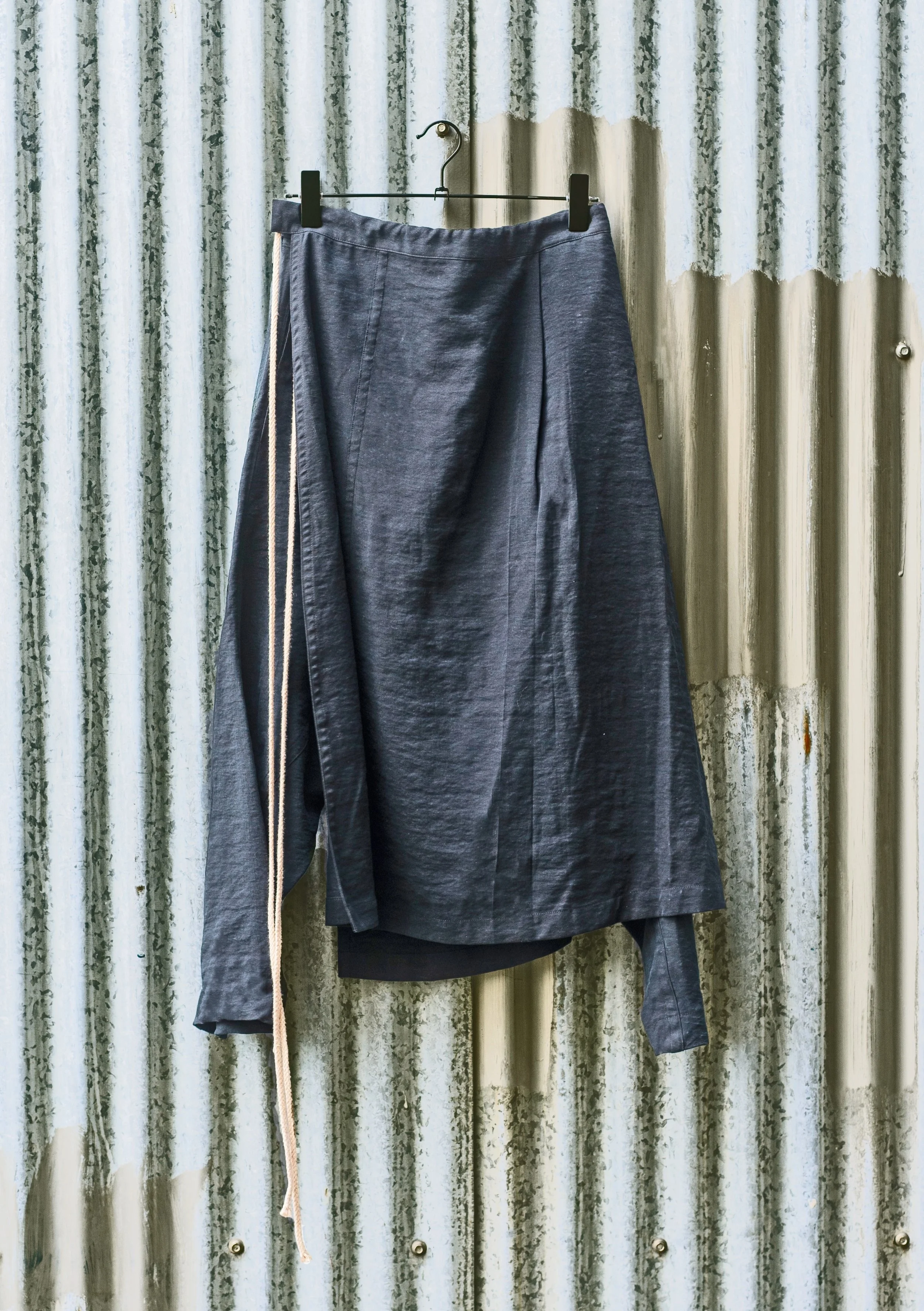 A dark gray or black skirt hanging on a hanger, with a long shirt or coat hanging beside it. The clothing is displayed against a weathered, corrugated metal wall.