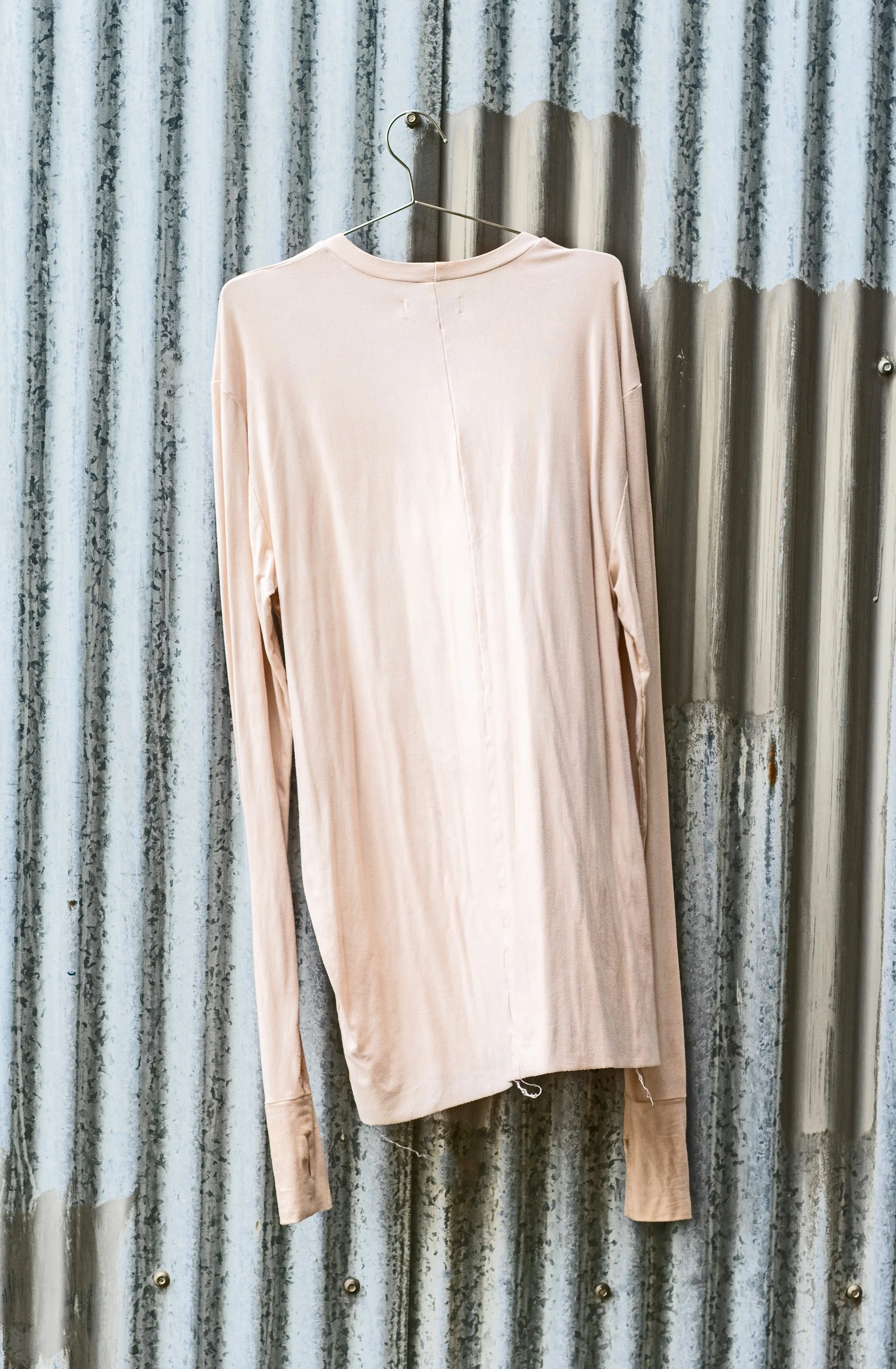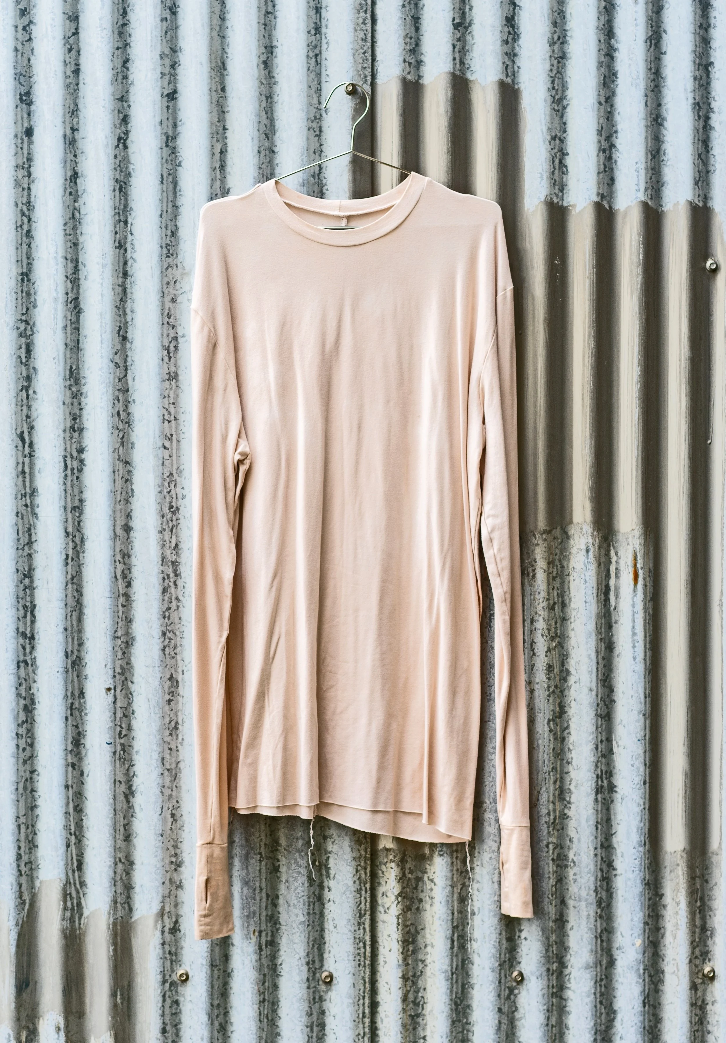 A light pink long-sleeve shirt hanging on a hanger against a corrugated metal background.