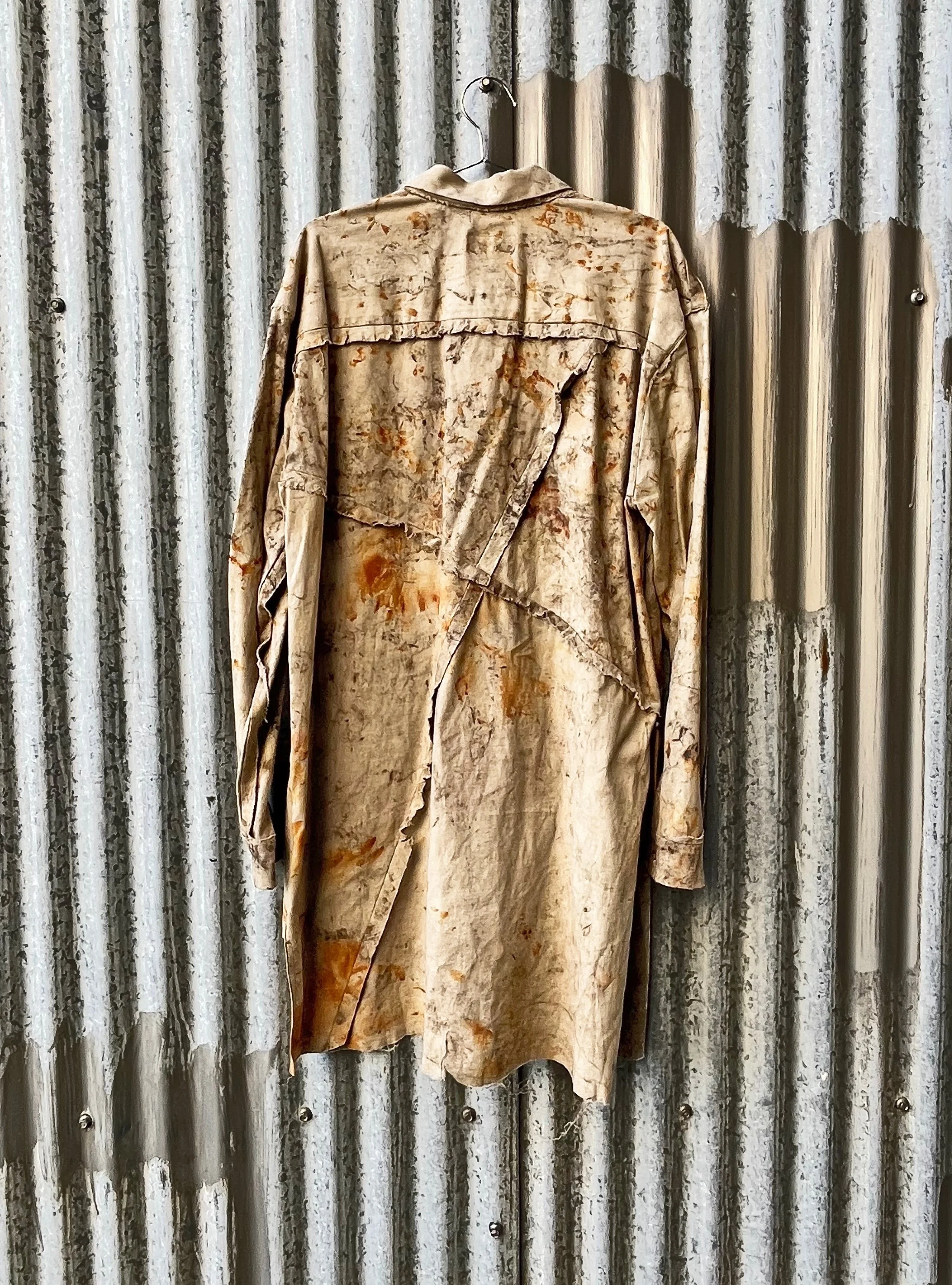 A dirty, stained, and worn cream-colored shirt under a brown jacket hanging on a rusty metal wall.
