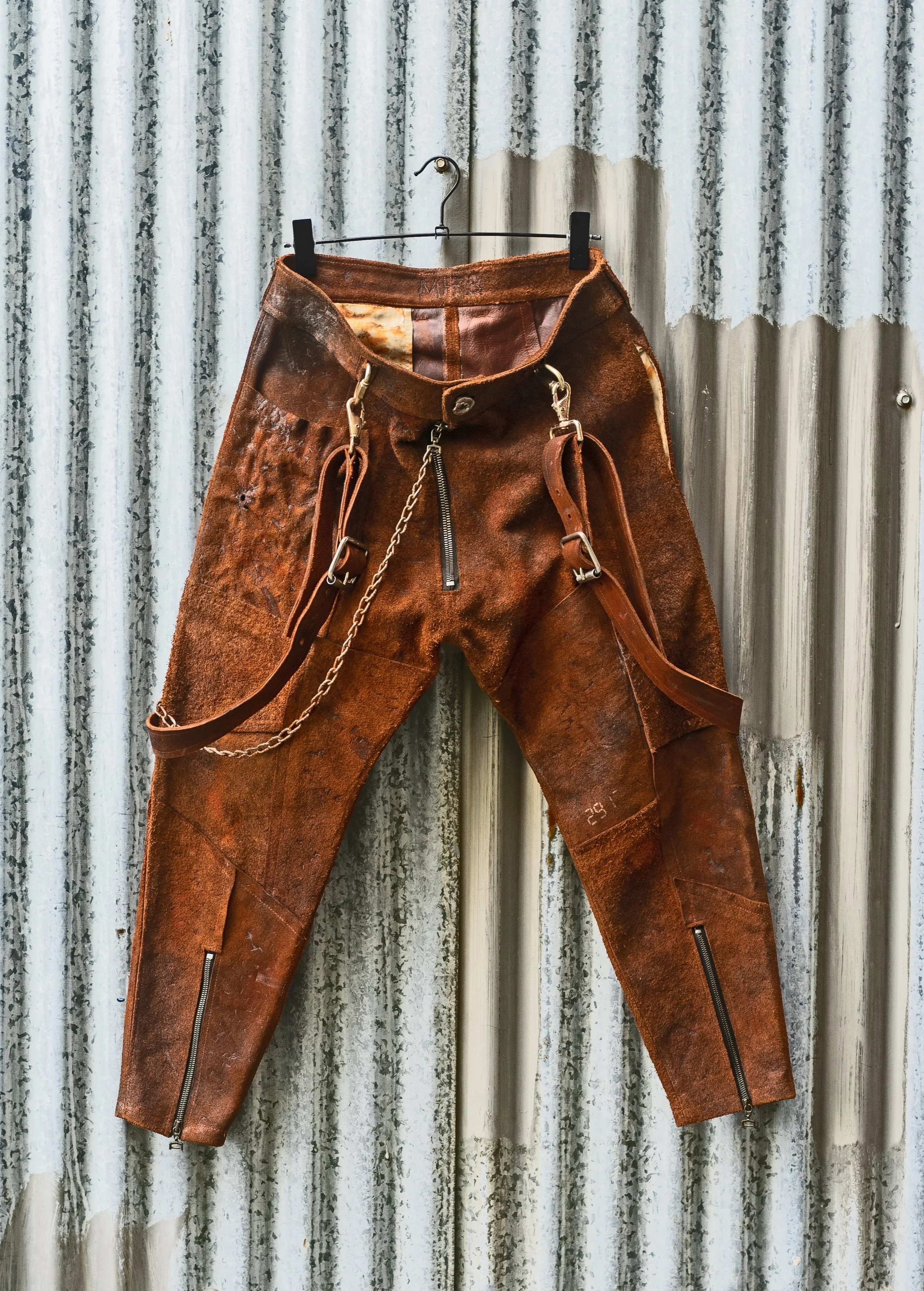 A pair of brown leather pants with a chain and strap hanging on a black hanger, against a corrugated metal background.