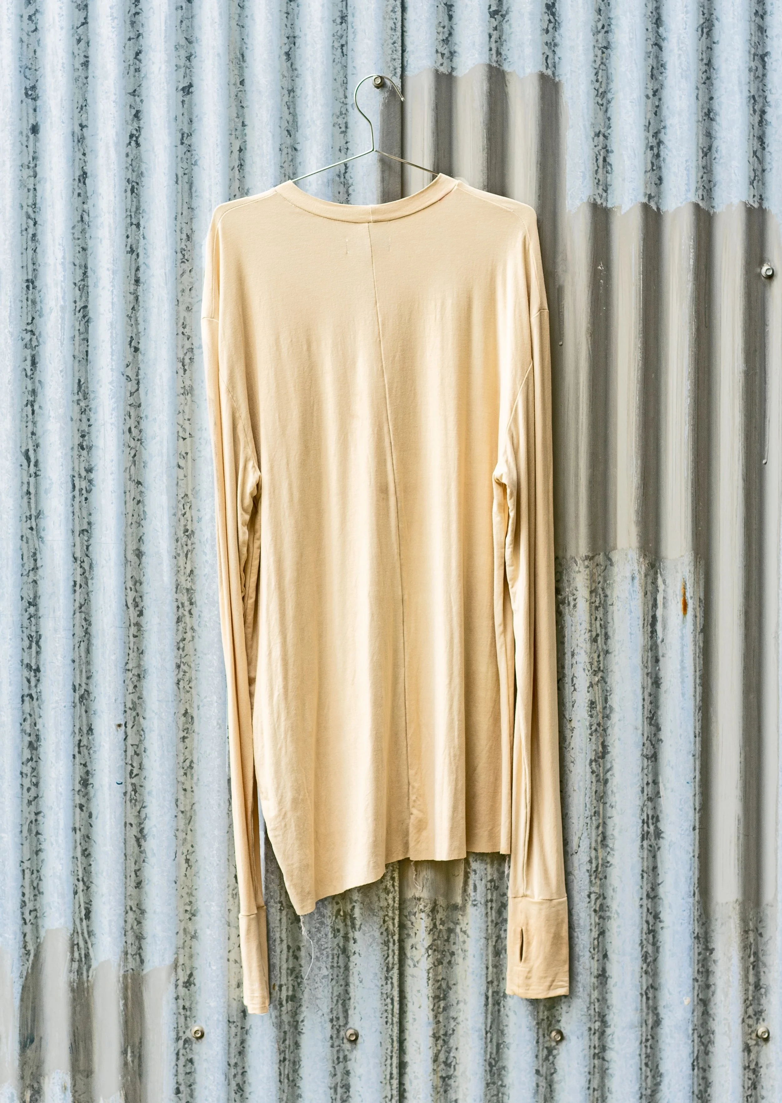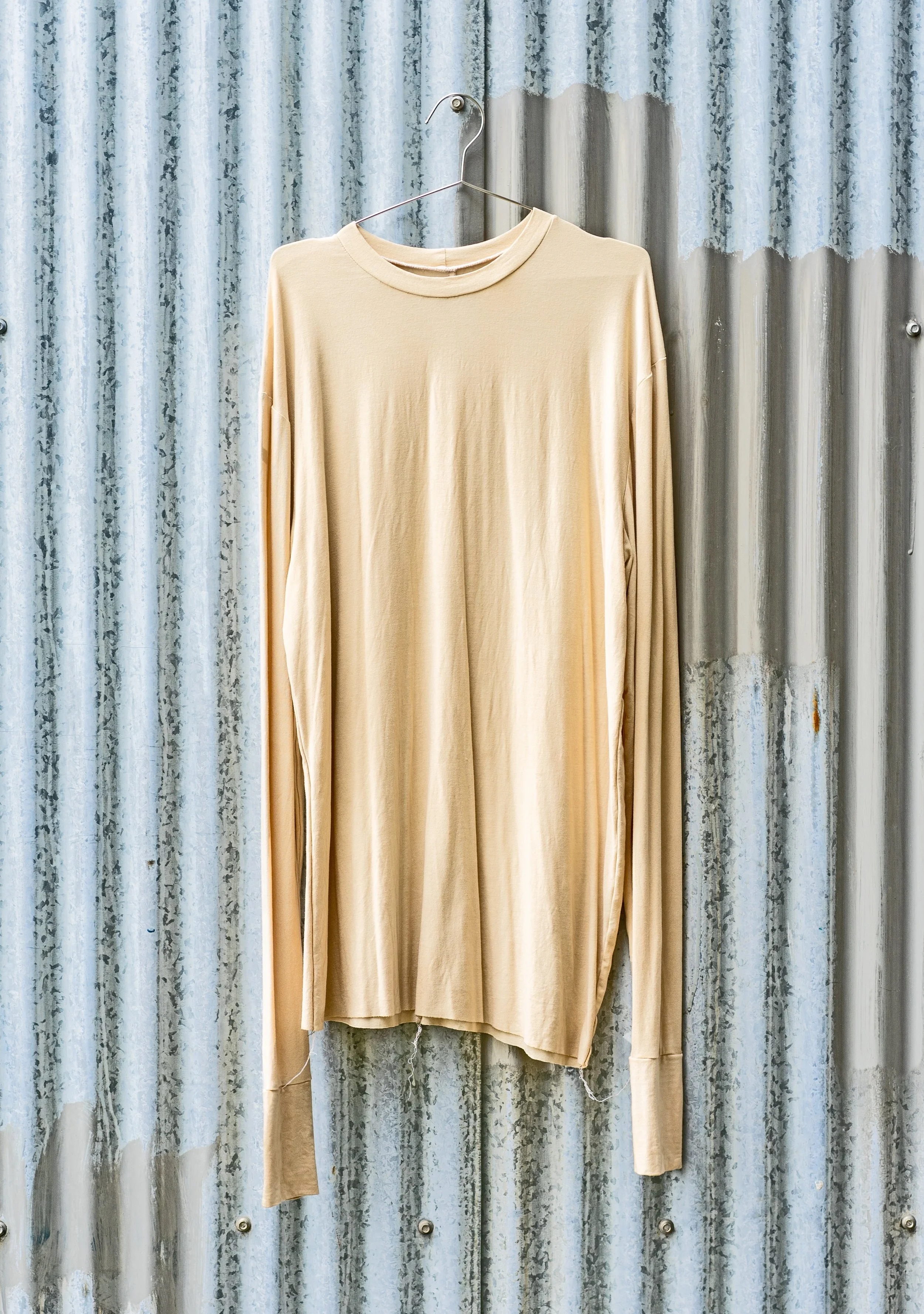 Beige long-sleeve shirt hanging on a hanger against a corrugated metal background.