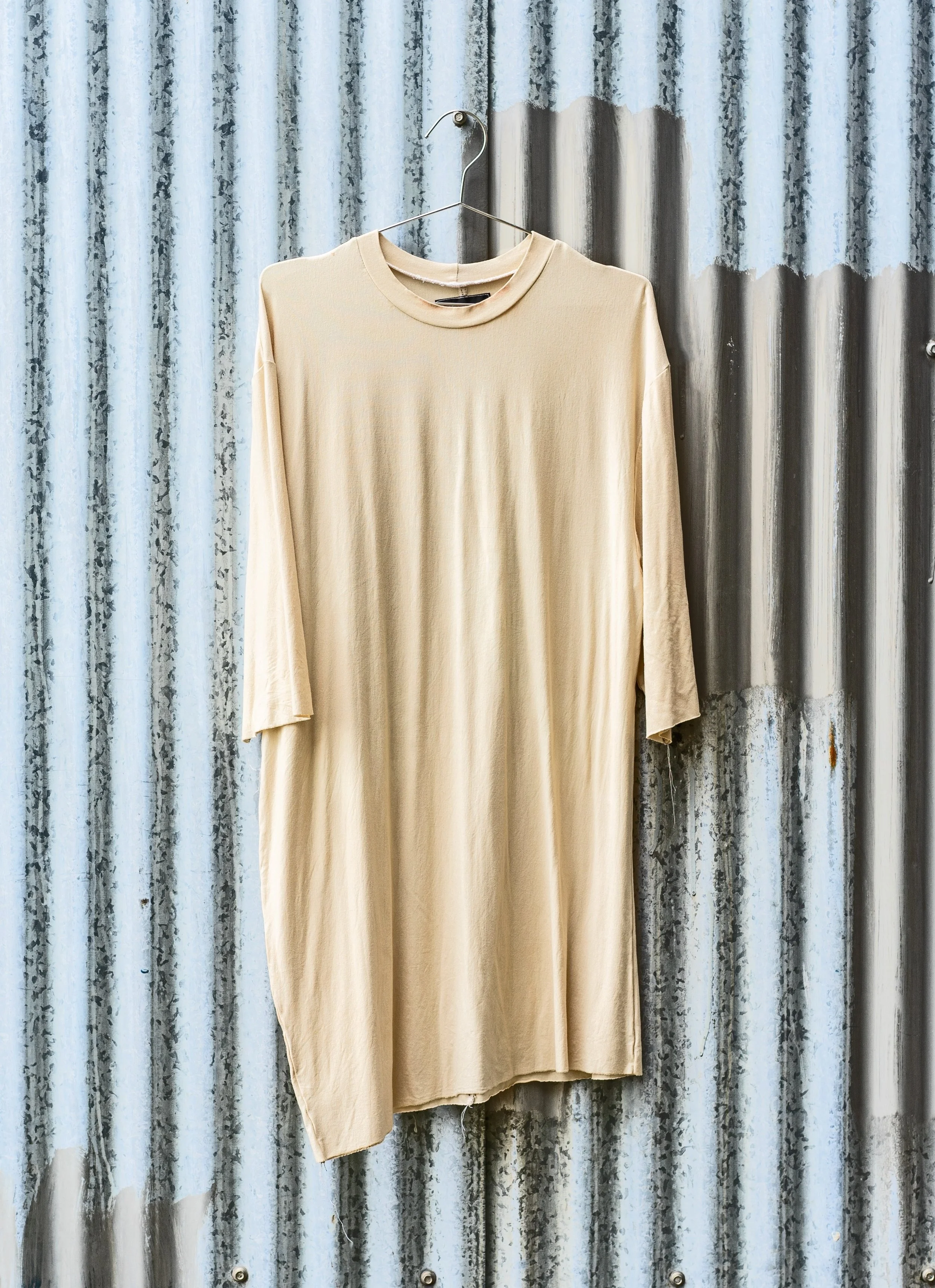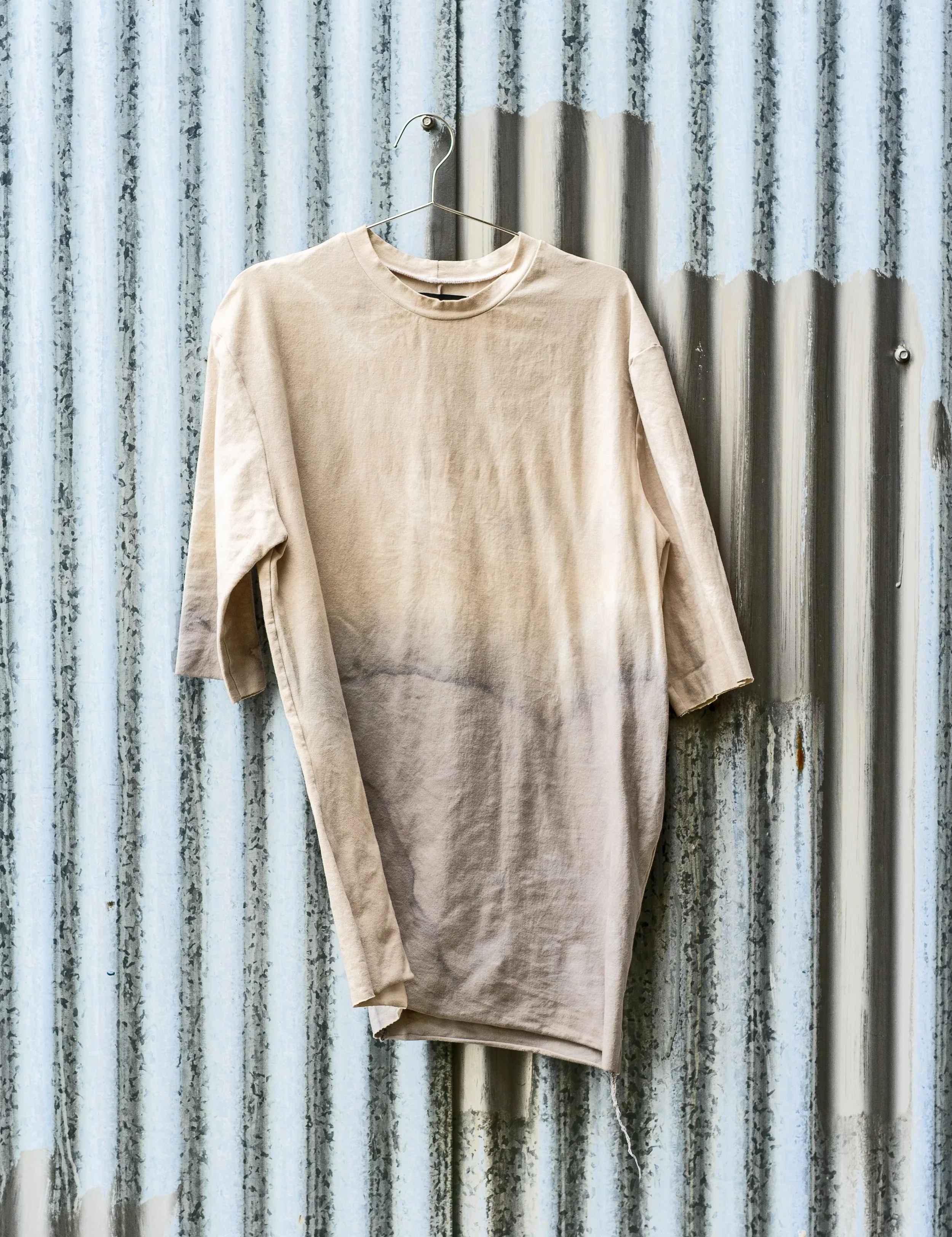A beige distressed long-sleeve t-shirt hanging on a wire hook against corrugated metal siding background.