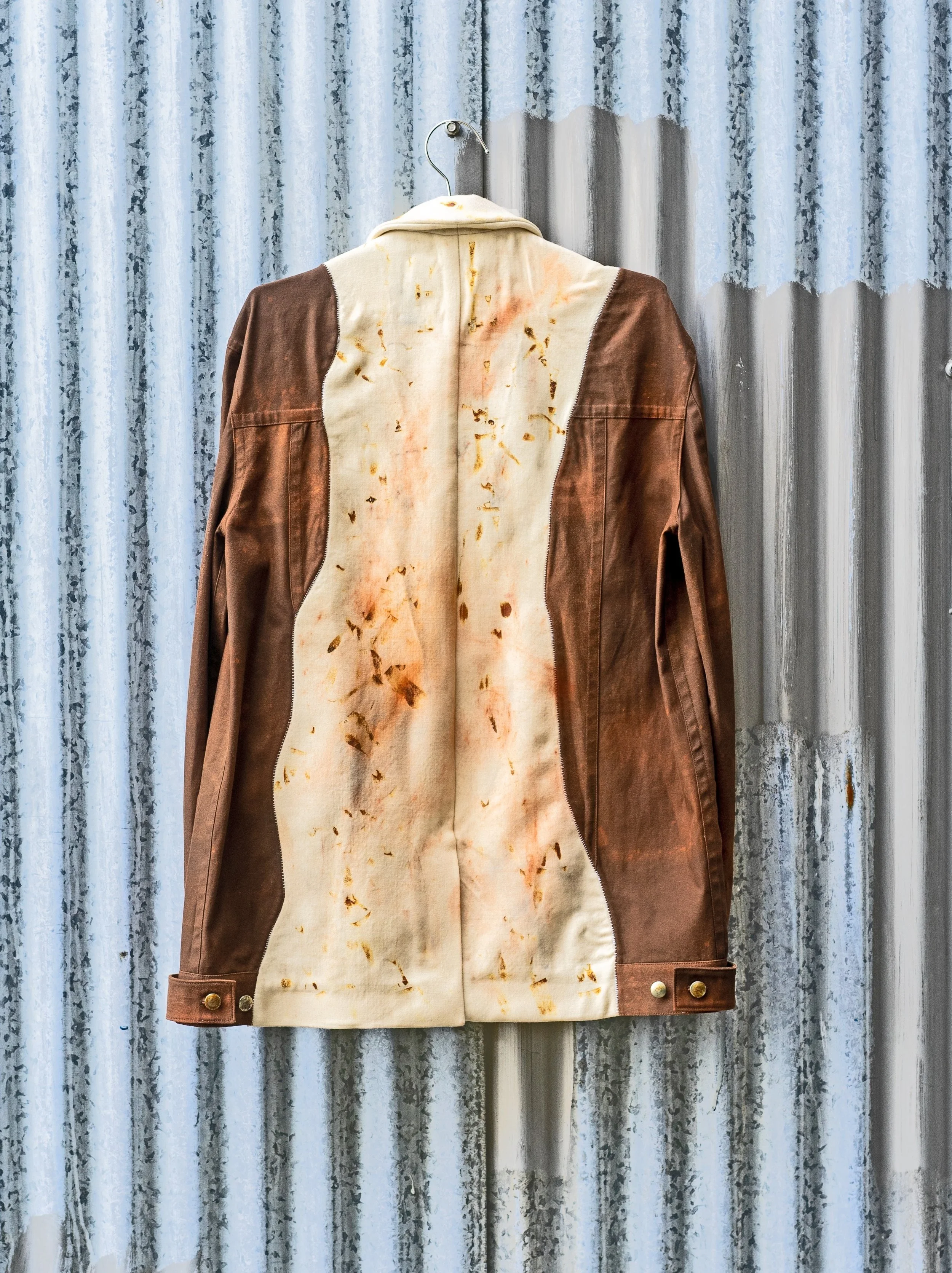 A beige and brown distressed leather jacket with rust-colored stains hanging on a metal hanger against a weathered corrugated metal wall.