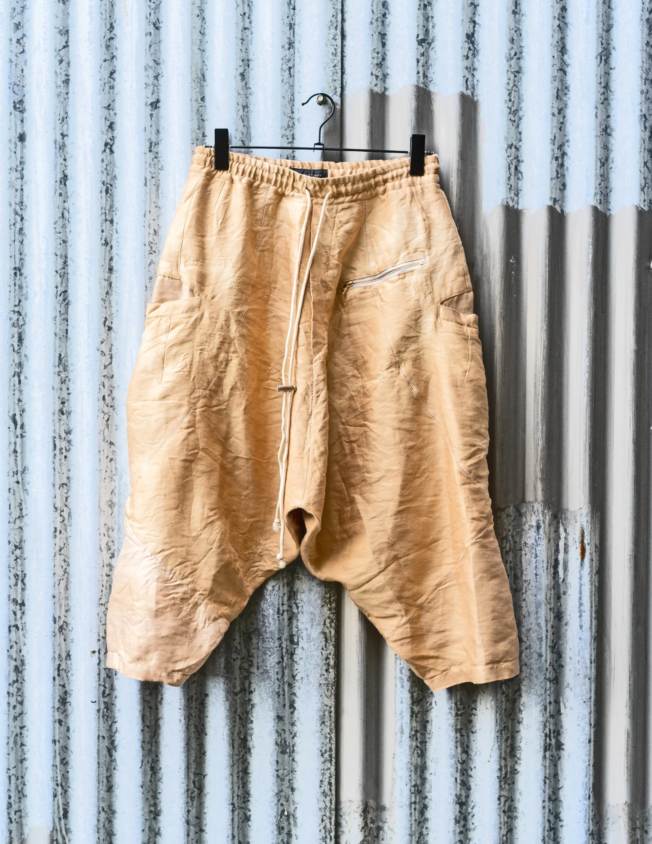 Beige harem-style pants with large pockets hanging on a black hanger against a corrugated metal wall.