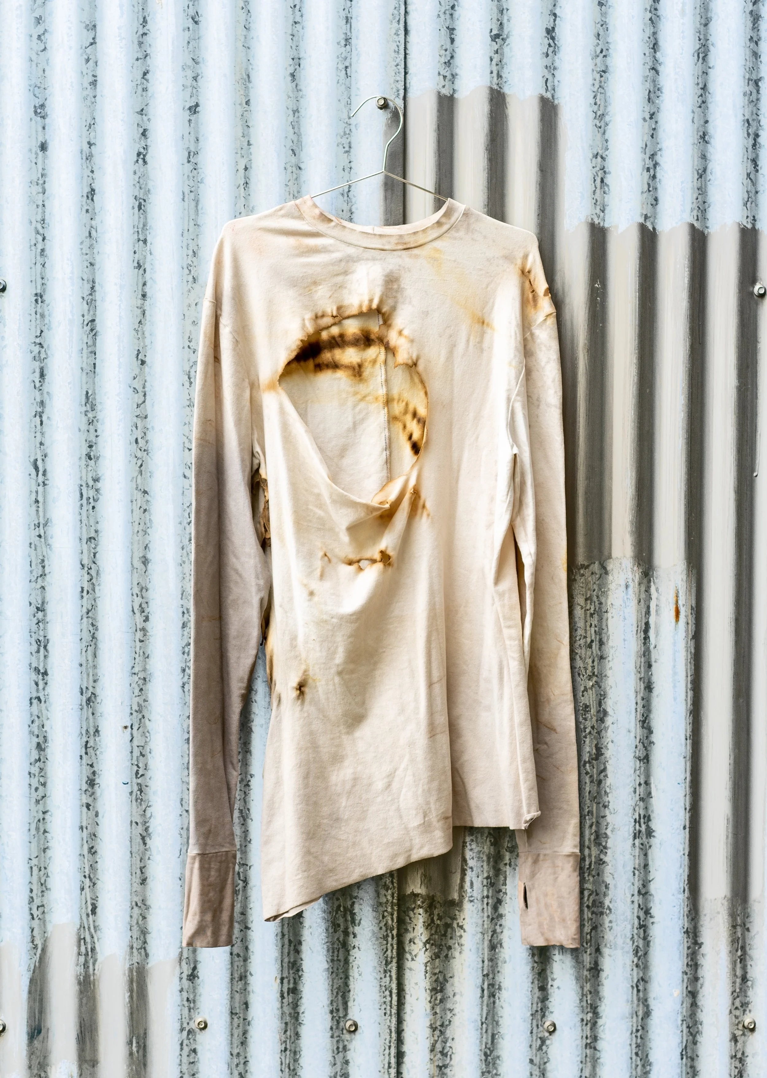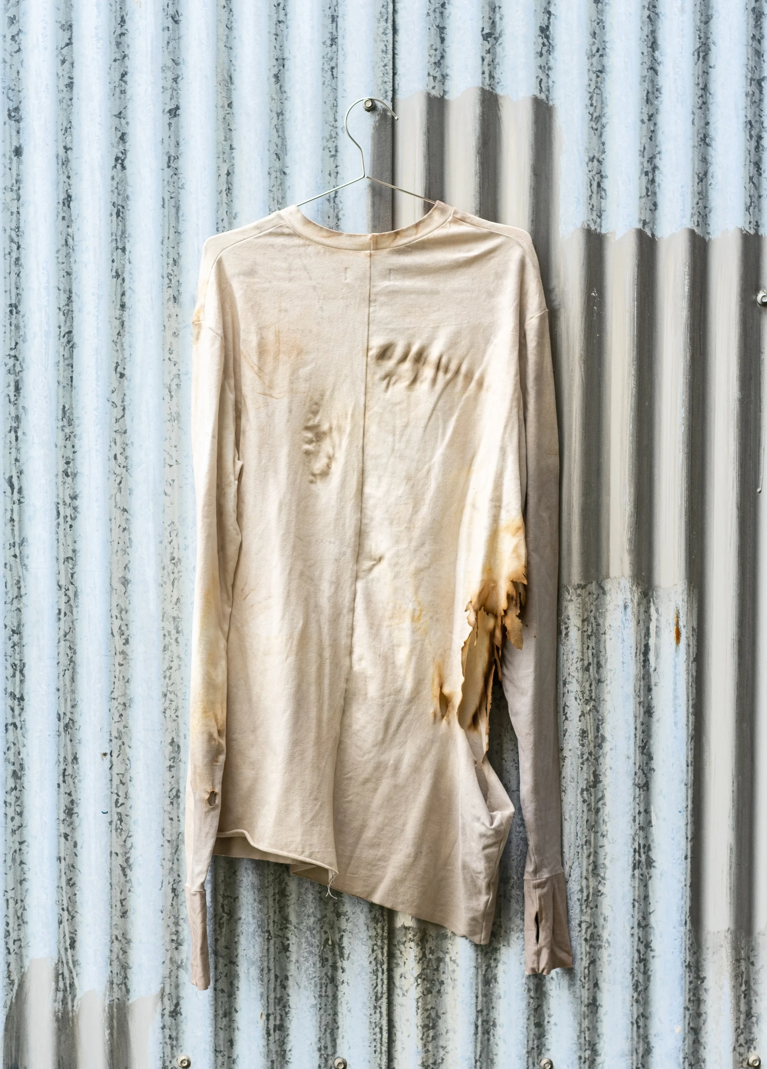 A beige long-sleeve shirt with multiple burn marks and holes hanging on a metal hanger against a corrugated metal wall.