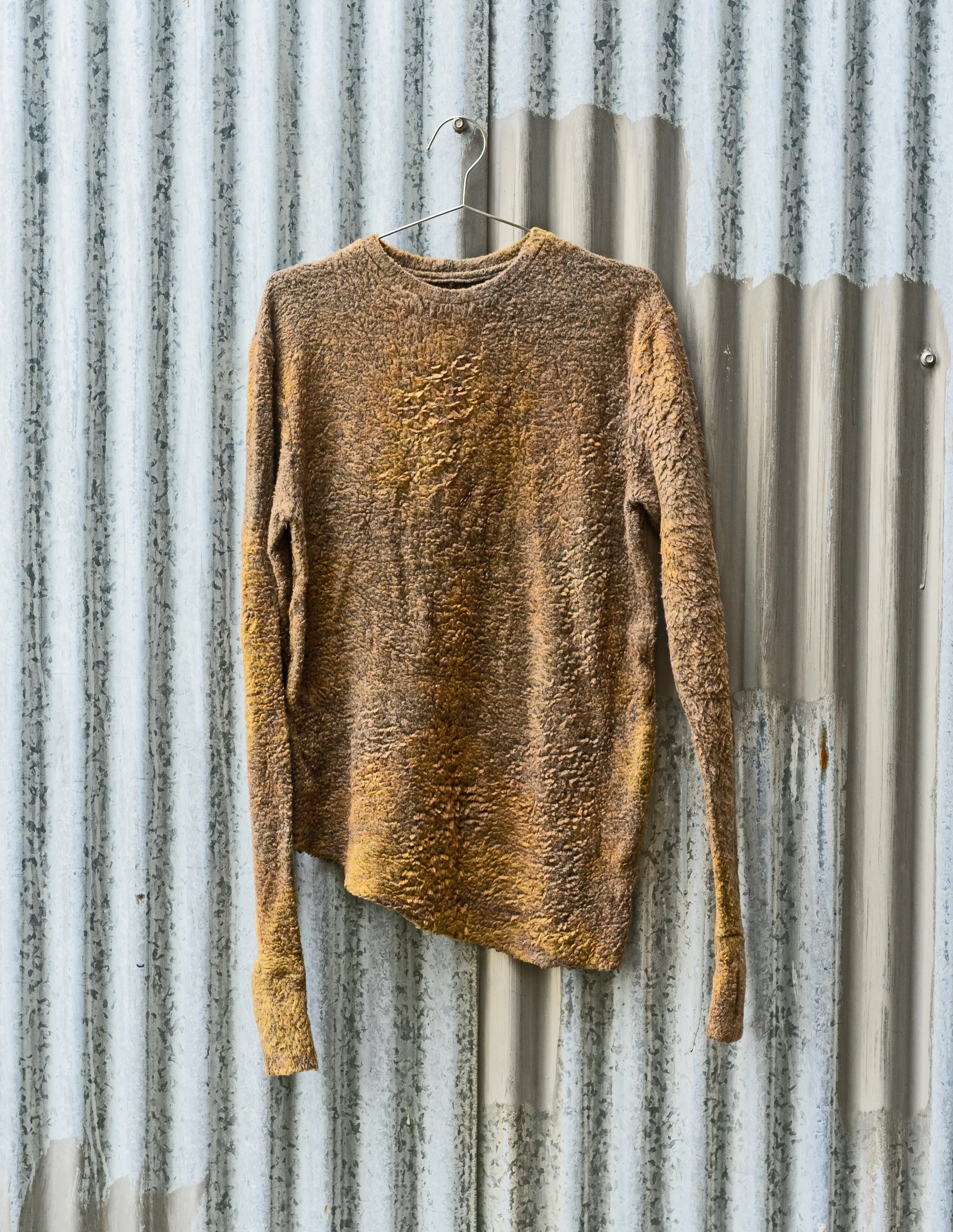 A brown, textured sweater hanging on a metal hanger against a corrugated metal wall.