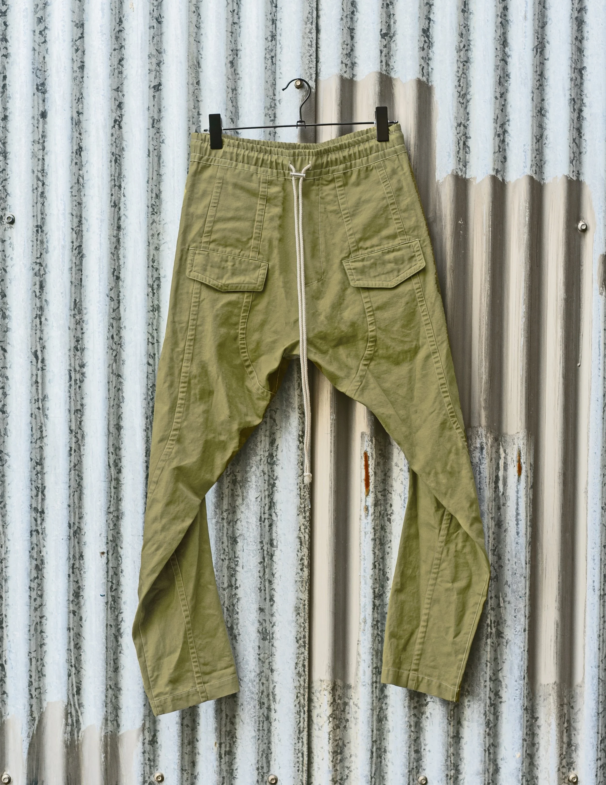 Olive green utility pants hanging on a black hanger outdoors against a corrugated metal wall.